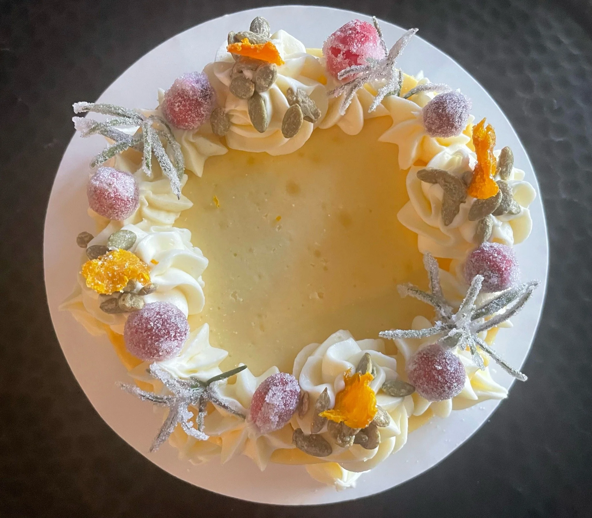 3 layer cake (2 layers of gingerbread cake, 1 layer eggnog cheesecake, cranberry curd interior glaze, bourbon cream cheese frosting)